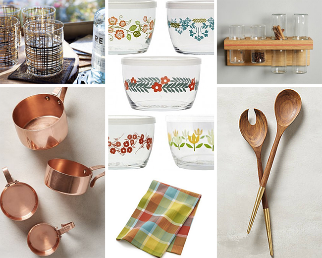 | Gold old fashioned glasses – Measuring cups – Vintage floral storage – Plaid dish towel – Spice Rack – Serving set |