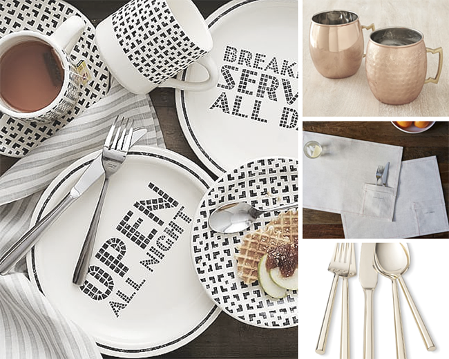 | City diner set – Mule mug – Linen pocket placement set – Gold flatware set |