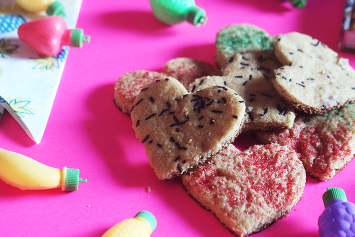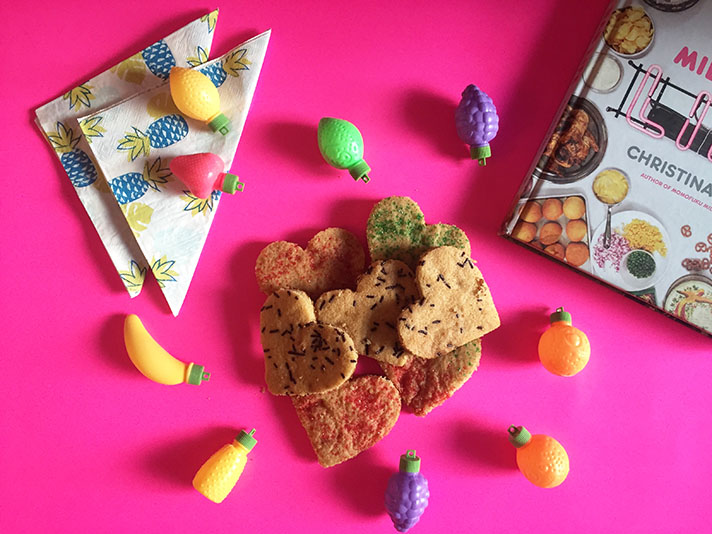 Christina Tosi presents this recipe in her new book Milk bar life as a “huge cookie” and a lot thicker than the ones we baked. We adjusted it from the original squares to hearts and included some new ingredients as well, making our version of these cookies. You’ll need 2 cups of sugar (used 1 cup of granulated sugar and 1 cup of brown sugar) 2 sticks of butter, unsalted 2 eggs (added 1 extra!) 1/2 cup of Olive oil 1 1/2 tsp of mexican vanilla extract (the best!) 1 tsp salt 1 tsp baking soda 2 1/2 cups of all-purpose flour Decorate with sprinkles (added chocolate, milk chocolate chips, green and red sprinkles) Mix The butter, sugar, eggs, oil, vanilla extract in a mixer until all ingredients are combined, about 4 minutes. Add flour, baking soda and a bit of salt at the end and mix well. Bake Make sure to add lots and lots of sprinkles and bake for 20 minutes at 350F (add 3 to 4 more minutes if you want them firm) enjoy! xox |