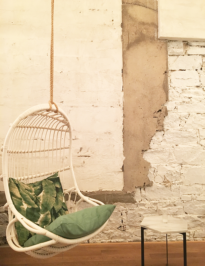 As soon as you enter, you’ll notice how all the perfect details are all together in one single place. White washed exposed brick walls, hanging chairs with banana leaf pillows, copper lamps and a great selection of greens to compliment the personality of this spot and for crazy plant lady like me, it was love at first visit.
